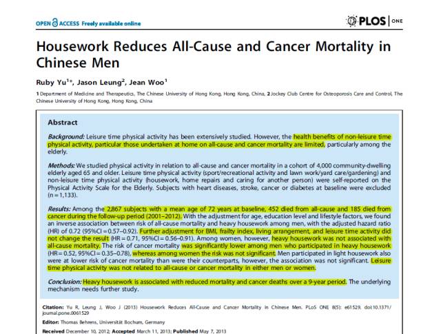 《做家务可以降低中国男性的全因死亡率和癌症死亡率》
